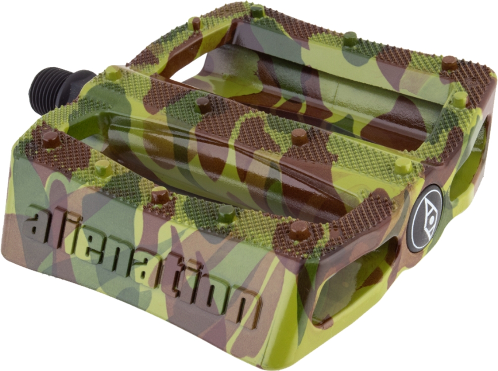 Alienation Effects Pedals 9/16'' CamoAlienation Effects Pedals have a dual concave nylon/fiber composite platform with 14 traction pins on each side. The body has a micro knurled pattern for steady traction and embossed side logos to catch the eyes of passersby. The 6mm broached chromoly spindle fits 9/16’’ pedals. Available in Black, White, and Camo.888571078266