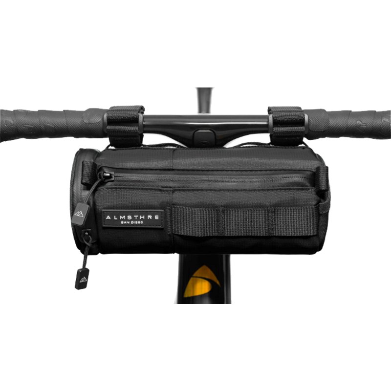 Almsthre Compact Bar Bag Midnight BlackThe Almsthre Compact Bar Bag features our hard-shell design, this bag will retain its shape regardless of what's inside. This bag features quick-access waterproof side zipper and mesh pockets, water resistant materials, and internal mesh organizer pocket. The dimensions are 3.5’’x7.5’’ wide and can fit up to 1.2L of necessities. There are multiple strap mounting options to fit on the handlebars. Available in Midnight Black.195893515448