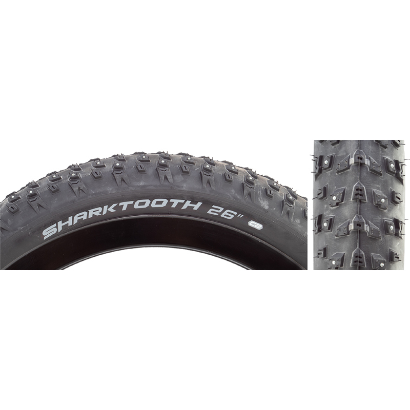 Arisun Sharktooth 26x4.0 Studded Folding TireArisun Sharktooth 26x4.0 Studded Folding Tire has 152 Tungsten Tipped studs with zinc plated steel base. 3 V shaped directional Stud design to maximaize Grip, Control and stability in Snow, Ice and All Terrain. Folding Bead at 60 TPI with a weight of 1499gms.6938112668693