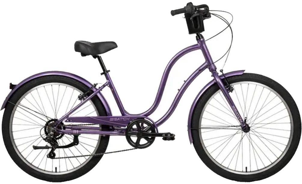Batch Women’s CB.1 26'' Large Eggplant The Batch Women’s CB.1 Cruiser Bicycle has a relaxed, upright comfort-focused frame and swept-back handlebars to create a natural riding position that takes pressure off your back, shoulders, and wrists. The 26” wheels with wide 2.4” tires are smooth and stable on pavement while helping to absorb bumps and cracks. The 7-speed Shimano drivetrain offers simple, intuitive shifting to handle gentle hills and longer neighborhood rides without overthinking it. Linear pull brakes provide consistent, easy-to-control stopping power for everyday conditions. A kickstand, cup or phone holder, and bell come standard, so the CB.1 is ready for casual rides and quick stops right out of the box. Available in Sweet Pink and Eggplant. 811950032054