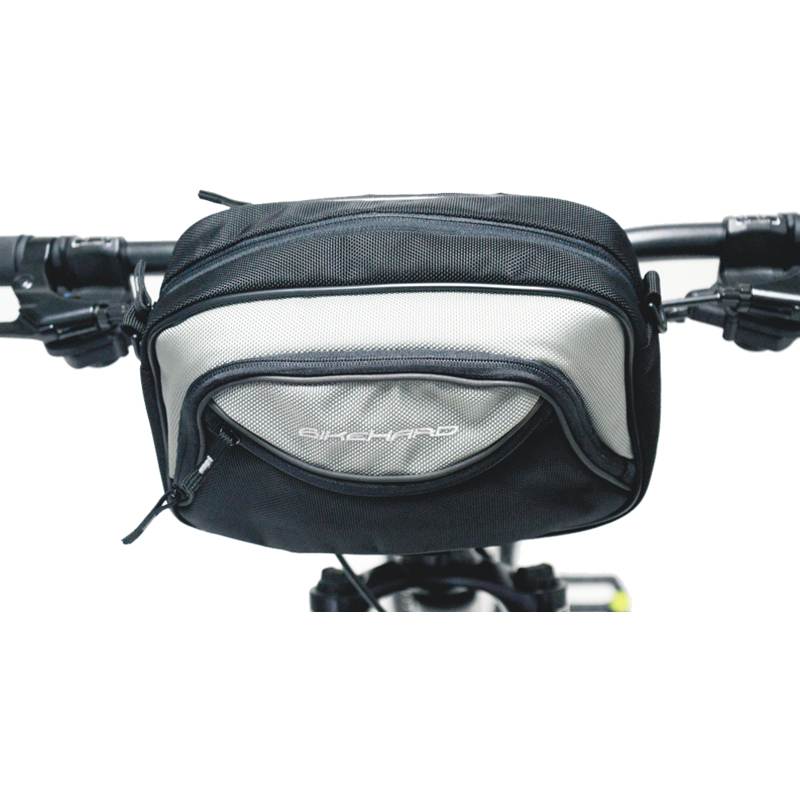 BikeHard Urbanite Handlebar BagThe BikeHard Urbanite handlebar bag an ideally sized storage solution that mounts directly in front of the rider. Internally padded to insulate and protect, the main compartment is 210ci of main space with a full height mesh zippered partition for small items. Two additional front pockets are just as easily accessed by top zippers, with two more partitions in the second largest compartment. Stitched from an incredibly resilient and long lasting 600x600D Polyester and reflective piping, this bag is as sophisticated looking as it is durable. A carrying stap is included along with a highly innovative mounting system so to remove, simply twist the knob, snap on the strap clips and take your belongings with you.817616023152