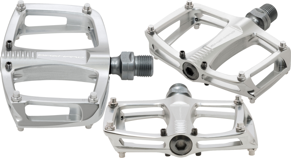 BikeHard Urbanite Platform Pedal SilverExtruded from a single piece of 6061 aerospace grade aluminum, the BikeHard Urbanite platform pedal is one of the most eye pleasing lightweight city pedals on the market today. Once extruded, each pedal body is CNC machined from every angle to remove excess material, enhance a uniquely sexy look, and accept 12 inserted traction pins. Combined with the slight concaved angle of the shoe area, these replaceable traction pins markedly enhance grip on even the slipperiest of days. A low profile heat treated cro-moly steel spindle is then built into the pedal body with premium sealed cartridge bearings for smooth uninterrupted pedal motion. Weighing in at an exceptionally light 230 grams per pair, the Urbanite pedal comes finished in either an sandblasted scratch resistant black or a high polished silver.850228007837