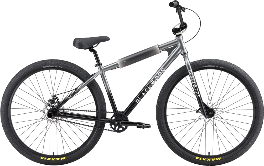 Black-Ops SpecOp-29’’ Disc Black/GreyThe Black-Ops Specop-29’’ Disc features a 6061-aluminum frame with reinforcing gussets at critical points, internal headset, mid-BB shell, and disc rear dropout paired with a 4130 Chromoly fork with disc mount for extreme durability. There are 29" double-wall alloy rims with 14mm rear axle, disc ready sealed bearing hubs, and stainless-steel spokes. The 29" x 2.50" Maxxis Hookworm tires are great on any surface. There is a single-speed drivetrain with a three piece chromoly BMX cranks with sealed BB. Comes with a Black Ops SpecOp custom BMX saddle with anti-slip surface and Black Ops SpecOp 4130 chromoly handlebar. The rear disc-brake with 2-finger lever gives you powerful and sensitive stopping power. Comes with Black Ops rear pegs and Black Ops custom 3-piece pad set. The suggested rider height is 5'4’’ and up. Available in Black/Grey and Silver Flash.888571100035