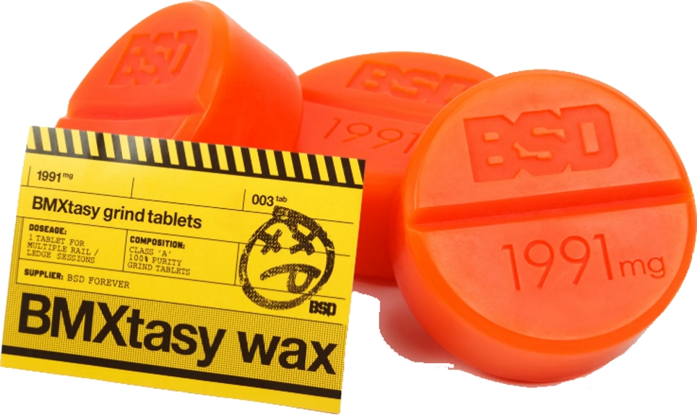 BSD BMXtasy Grind Wax 3 Piece OrangeThe BSD BMXtasy Grind Wax 3 Piece comes with 3 Class ‘A’ 100% purity grind tablets. One tablet can be used on multiple sessions. Engineered to reduce friction while grinding. Available in Orange and Purple.5060792160806