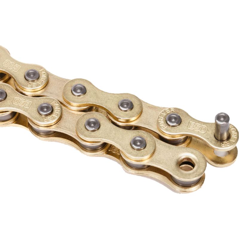 BSD Forever Chain 1/2’’ x 1/8’’ GoldThe BSD Forever Chain 1/2’’ x 1/8’’ super-tough chain with a pre-installed half-link, rustproof Teflon coating, stamped BSD logos, and mushroomed pins. Compatible with 8t drivers. Depending on your gearing, the pre-installed half-link can help you position your wheel exactly where you want it. Comes with 96 links. Weighs 370g. Available in Gold.5060792166860