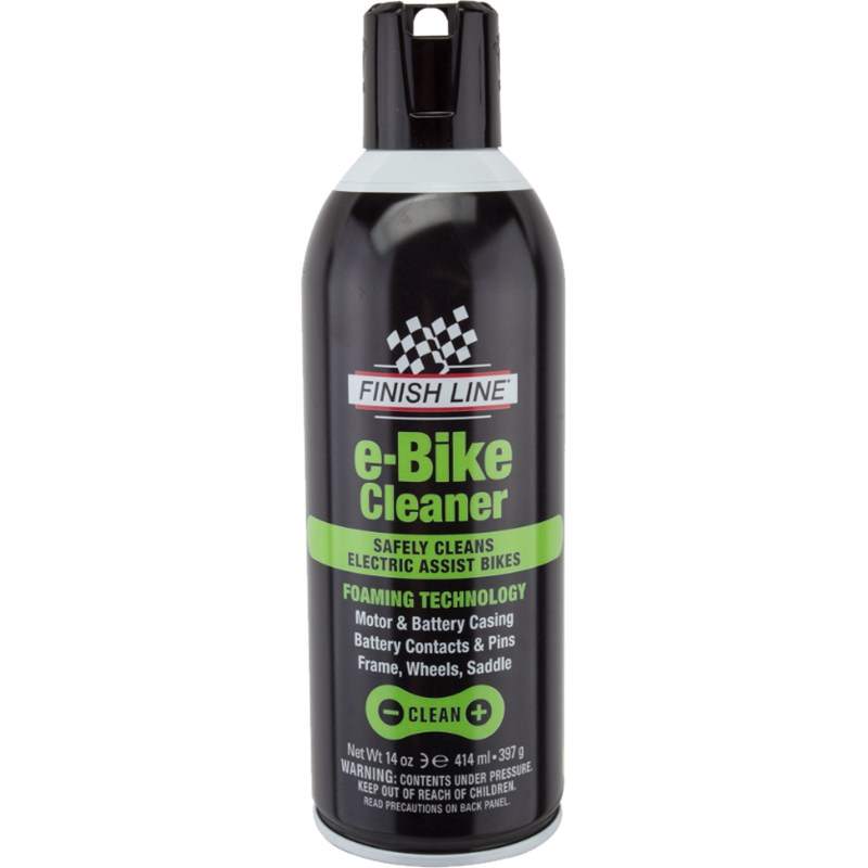 Finish Line e-Bike Cleaner 14oz SprayThe Finish Line e-Bike Cleaner is a foaming cleaner designed to e-bikes to remove grime before it migrates into your e-Bike’s electrical components. This spray is easy to use, safe, and great on anodized aluminum, steel, titanium, carbon fiber, matte finishes as well as contacts and electrical connections. Just apply and wipe gently with a soft cloth. Be sure surface is completely dry before putting battery back in. Non-caustic and requires no rinsing with water which could cause electrical problems. This is the 14oz spray version.036121710610