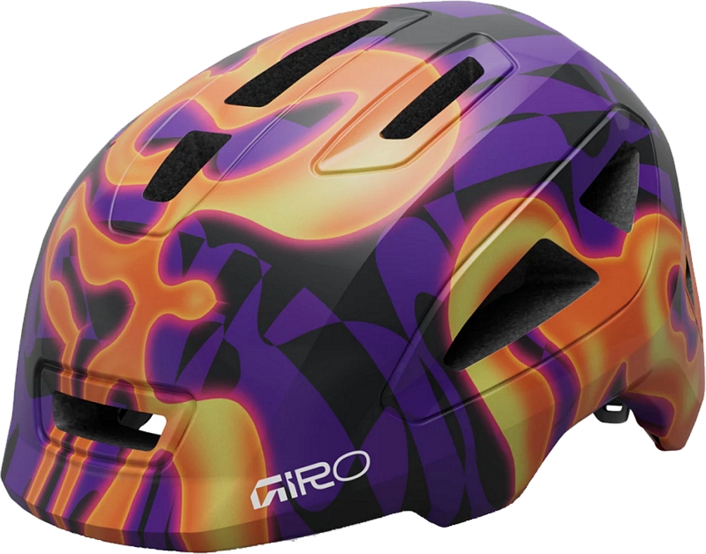 Giro Scamp II Youth Helmet X-Small Purple LavaThe Giro Scamp II Youth Helmet is the smallest helmet designed for young or future riders, but it still goes big with features and style. Taking design cues from adult helmets like Manifest Spherical, this lightweight helmet features impact-dissipating EPS foam with a sturdy polycarbonate shell, plus 13 vents for efficient cooling power. The Roc Loc Junior fit system provides extra adjustability with a simple-to-use dial for several years of head protection for fast-growing rippers. The XS is designed for riders aged 1 and older while the Small is for riders aged 5 and older. Whether they're rolling along in a trailer or powering the pedals themselves, Scamp II is going to make kids want more bike time. Available in Matte Black/Red, Matte Midnight/Bright Green Ink, Matte Orange Towers, Matte Purple Towers, Matte Purple Libre, and Matte Screaming Teal/Bright Pink.199270037691