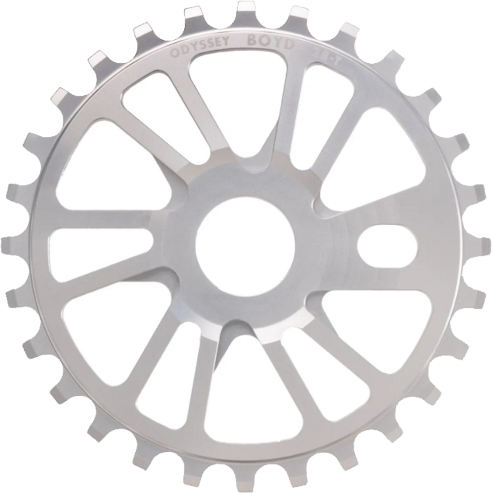 Odyssey Boyd Sprocket 30T Anodized SilverThe Odyssey Boyd Sprocket is Boyd Hilder’s Signature sprocket with a clean five spoke directional design CNC machined from lightweight 7075-T6 aluminum. The spokes increase in thickness towards the center for added strength and it comes in 25T, 28T, and 30T size options. Available in black only.630950942428
