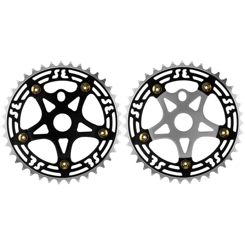 SE Bikes One Piece Alloy Chainring and SpiderThe SE Bikes One Piece Alloy Chainring and Spider has 39T and uses a One-piece style chainring with a spider. The black chainring has CNC machined silver teeth, an anodized spider, and ED gold bolts. Compatible with 1pc cranks and 1/2" x 1/8" chains. Available in Black and Black/Silver.