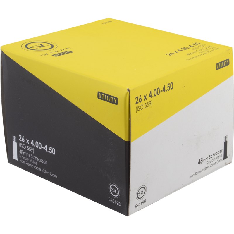 Sunlite Utility 26 x 4.0-4.5 Fat Bike Tube 48mm Schrader The Sunlite Utility 26 x 4.0-4.5 Fat Bike Tube works with bikes that needs a 48mm Schrader valve. These butyl rubber tubes are engineered for use inside tires of bikes. The valve core is non-removable. 888571119914