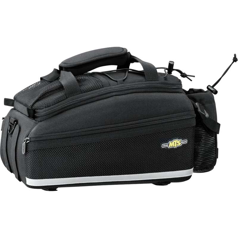 Topeak TrunkBag EX TT9645BThe Topeak TrunkBag EX TT9645B has two molded side panels outside of flexible 600 denier fabric to resist weather and keep your snacks insulated with EVA Foam. The main compartment is divided to help you organize better. There is a spot for your water bottle on the back and zippered compartments prevent contents from flying away as you travel. There are reflective markings to keep you visible and a safety light clip to increase your visibility further. The dimensions are 36x21x19cm or 14.2’’x8.3’’x7.5’’ and it weighs only 530g.883466011076