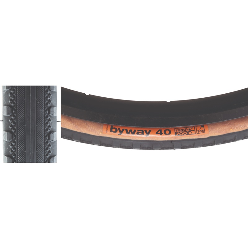 WTB Byway TCS 700x40c Tire Fold Tubeless Black/BrownThe WTB Byway TCS 700x40c Tire is engineered for road use with hardpack, dirt, and gravel riding. It uses a slick centerline with angular borders to keep everything smooth on sections of pavement. There are intermediate, diamond-shaped peaks provide steadfast traction under power. Consistent and more substantial side knobs extend down the side to protect it against rocks or gashes while exploring new areas. The Road TCS Technology uses a sealant optimized lightweight casing with folding TCS aramid bead and Dual Compound DNA rubber. This tire uses the Dual Compound DNA Rubber to increase grip and durability. Available in Black/Brown in size 700x40c.714401108240