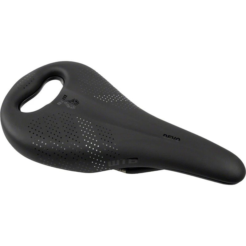 WTB Devo PickUp Stainless Saddle BlackThe WTB Devo PickUp Saddle considers that the additional weight of e-bikes creates new challenges when it comes to lifting your bike onto a rack, moving it around the garage, or hoisting it over rocks and roots on unrideable sections of trail. The Devo saddle solves this problem with its patented Pickup handle, which aids in lifting or pushing an e-bike in both transport and on-trail situations while remaining completely unnoticeable to the rider while pedaling. Our new Fusion Form base technology balances overall comfort and durability by fine-tuning the fiber content and dialing in a flex profile that is best for the Devo. Medium thickness padding eliminates pressure points in the sit bone area and provides lasting comfort for long rides that go a little longer than planned. The width contour of the Devo gradually increases for the front half of the saddle before quickly widening out to create the primary area for sit bone support. This allows you to stay seated and crank hard without the insides of your thighs rubbing on the saddle edges. A wide nose allows you to scoot forward to keep the front wheel on the ground during steep climbs that are only conquerable on an e-bike. This is the stainless rail version with medium padding and has dimensions of 142x260mm. Available in Black.714401656741